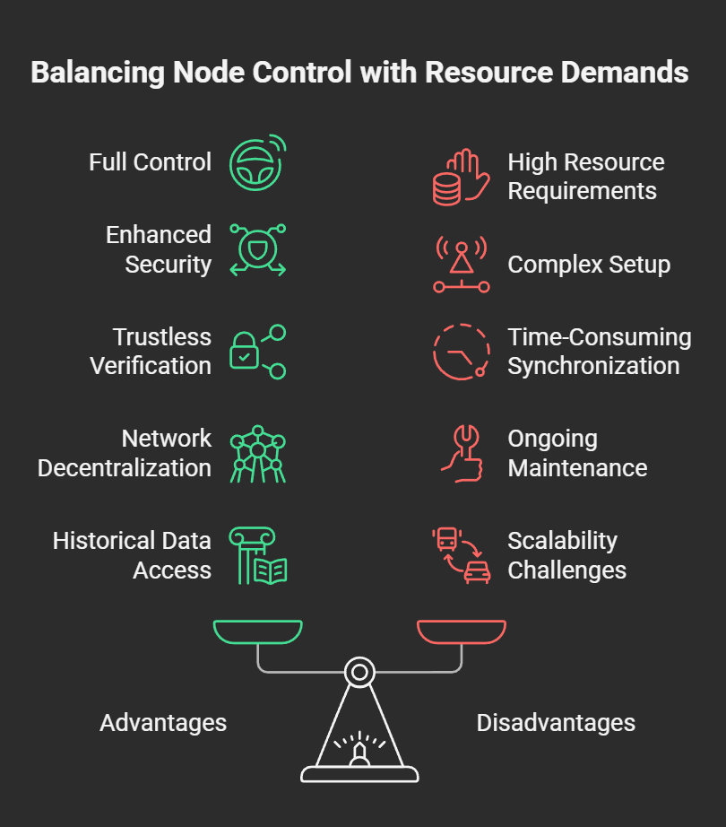 Ongoing Maintenance: Nodes require regular updates and maintenance to stay synchronized with the network and address security vulnerabilities.